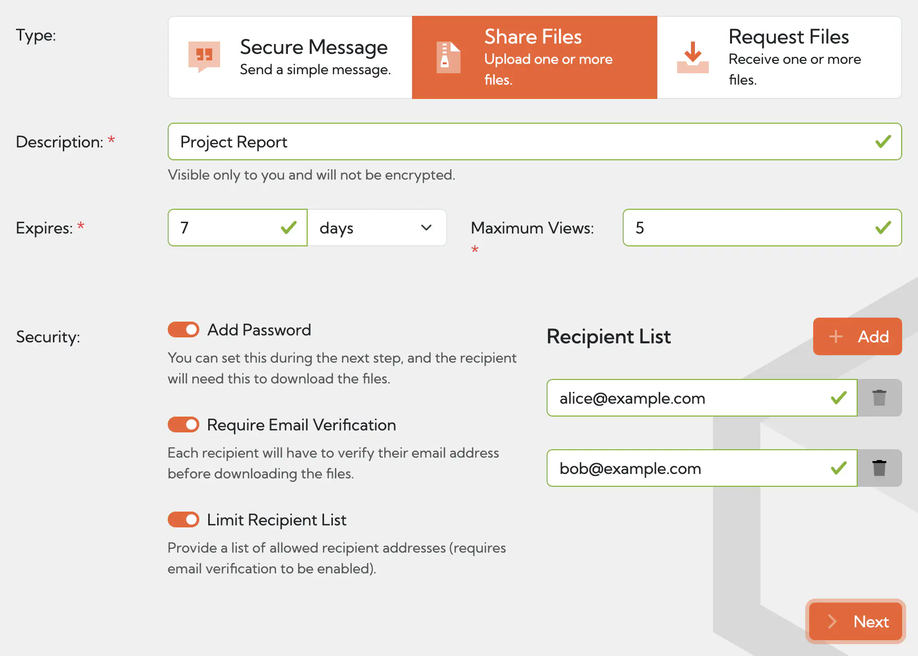- Restrict to specific recipients – Limit access to named email addresses only.