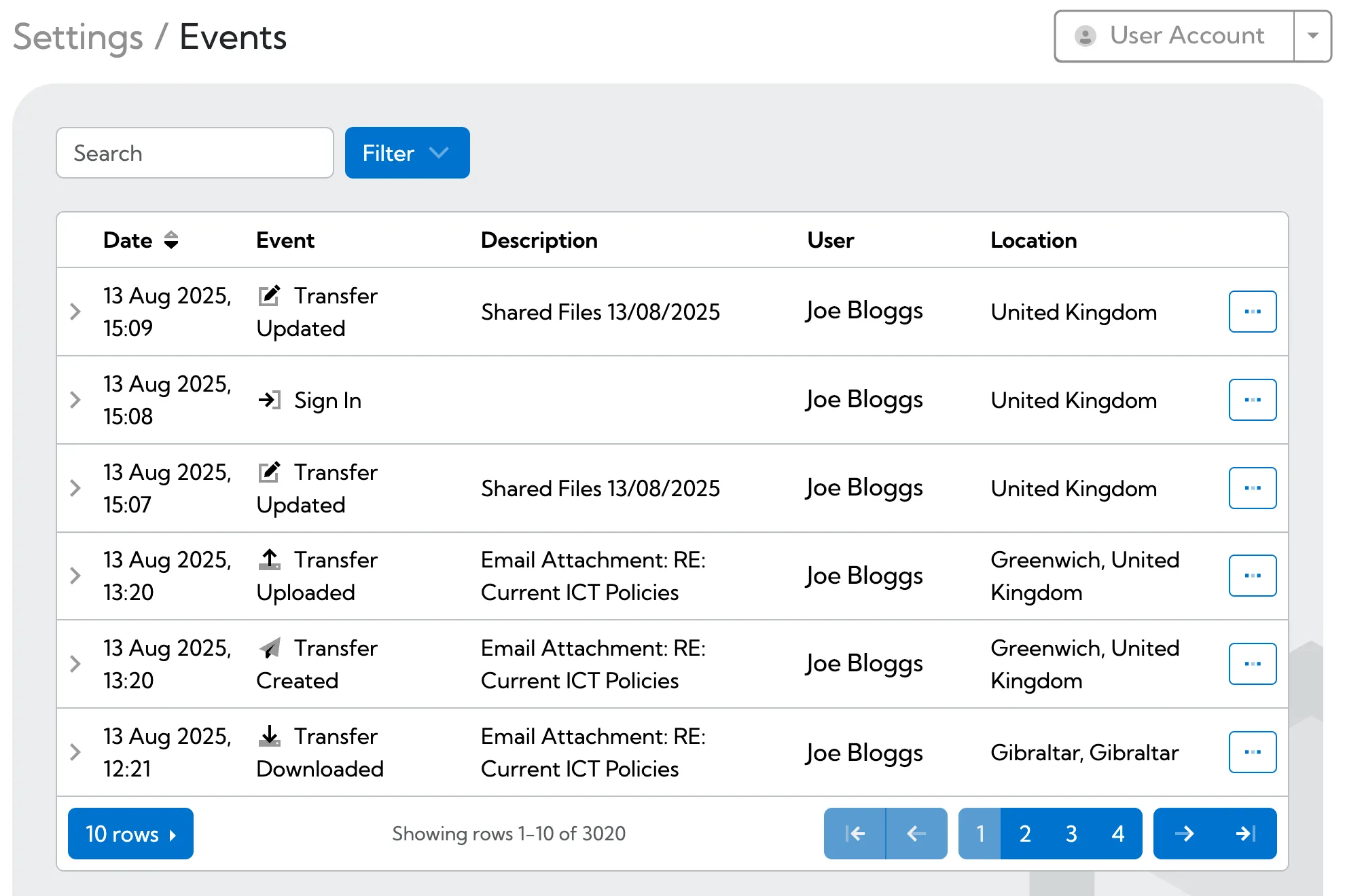 - Comprehensive audit logs – View all file activity, including uploads, downloads, and transfer settings.